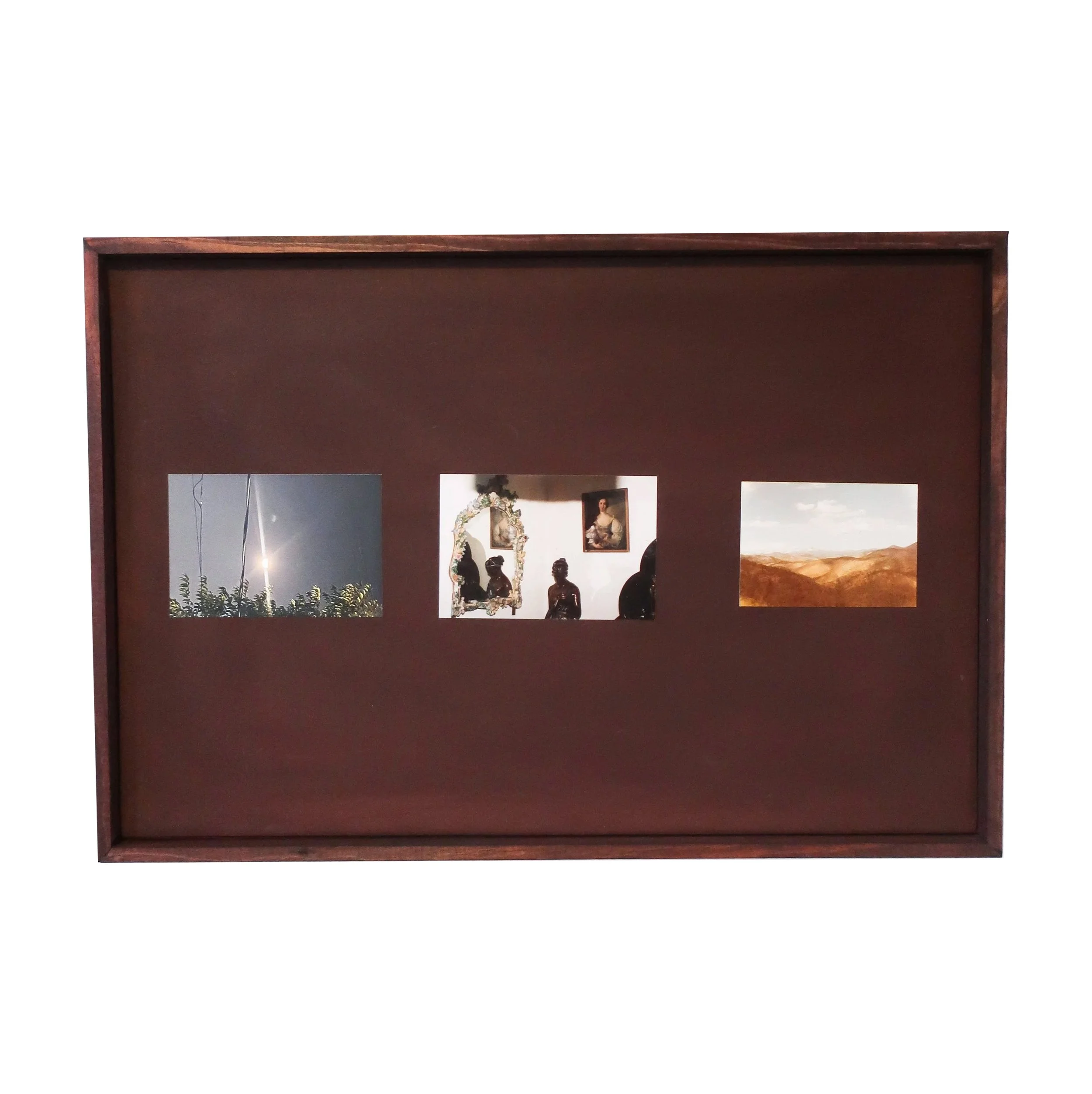 3 eyed raven, 2025, (3) photographs, repurposed frame, 9" x 4"