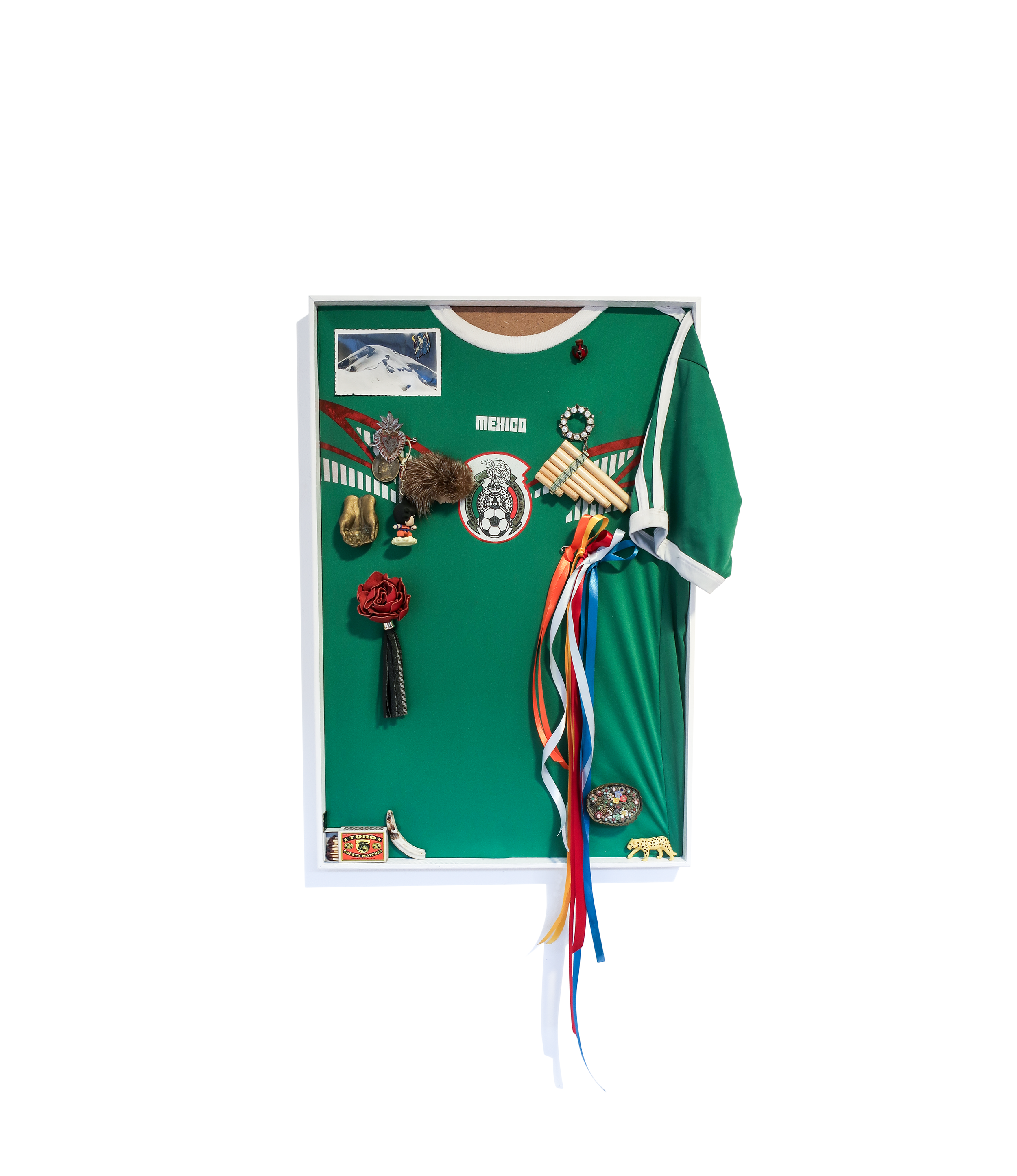 mexico, 2025, mixed media on soccer jersey, artist frame, 15.87" x 23.86"
