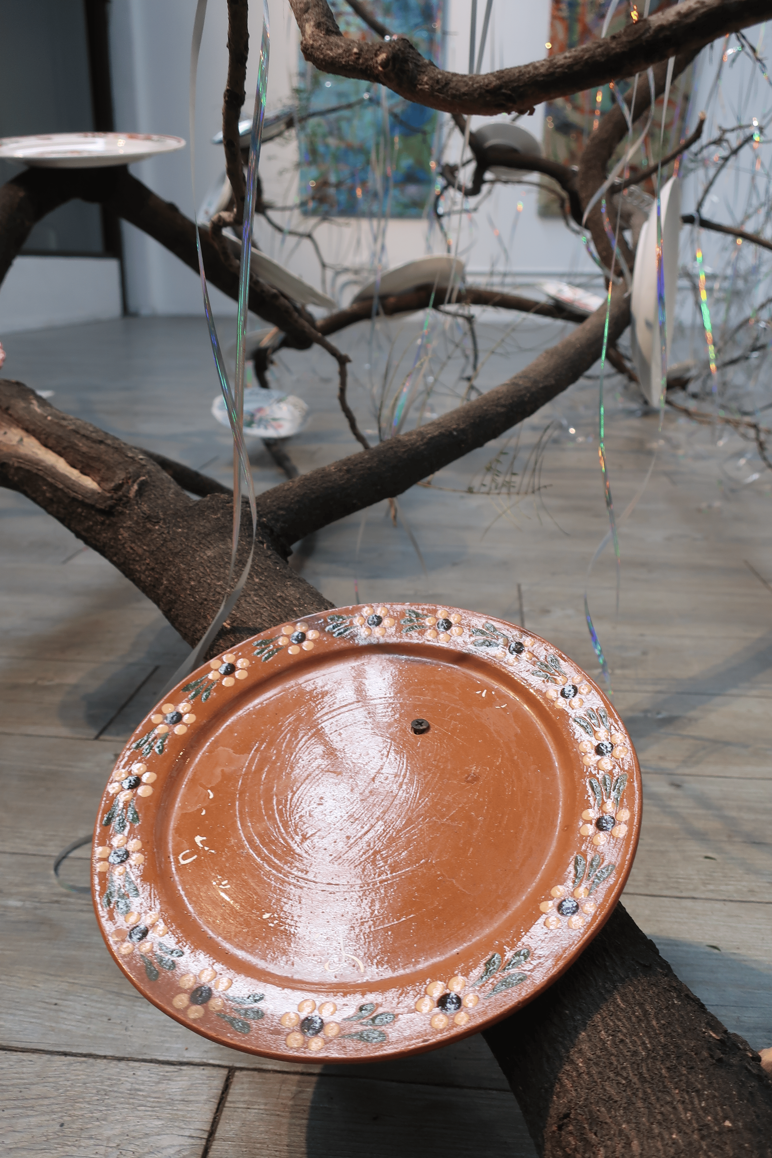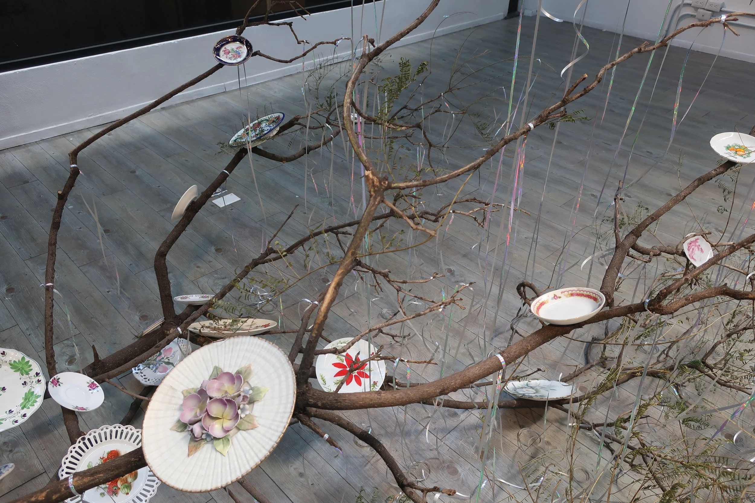 a break in the trees, 2025, jacaranda branch, (23) ceramic plates, metallic ribbon, 131" x 59" x 65"
