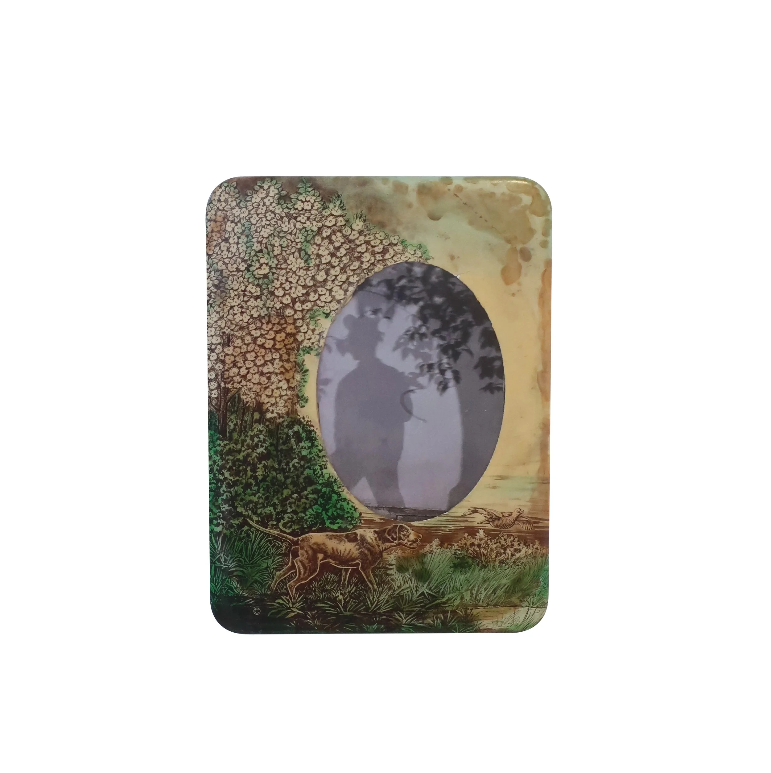 untitled self portrait, 2025, photograph, repurposed tin frame, 6" x 8"