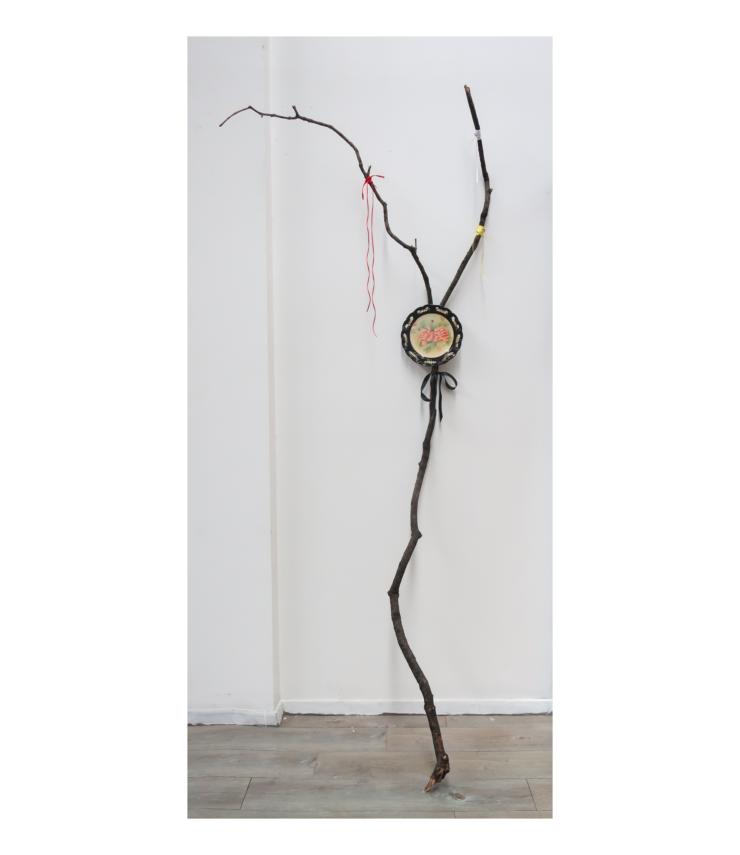 red, yellow, black, white, 2025, tree branch, colored ribbon, plate, 47" x 3" x 71"