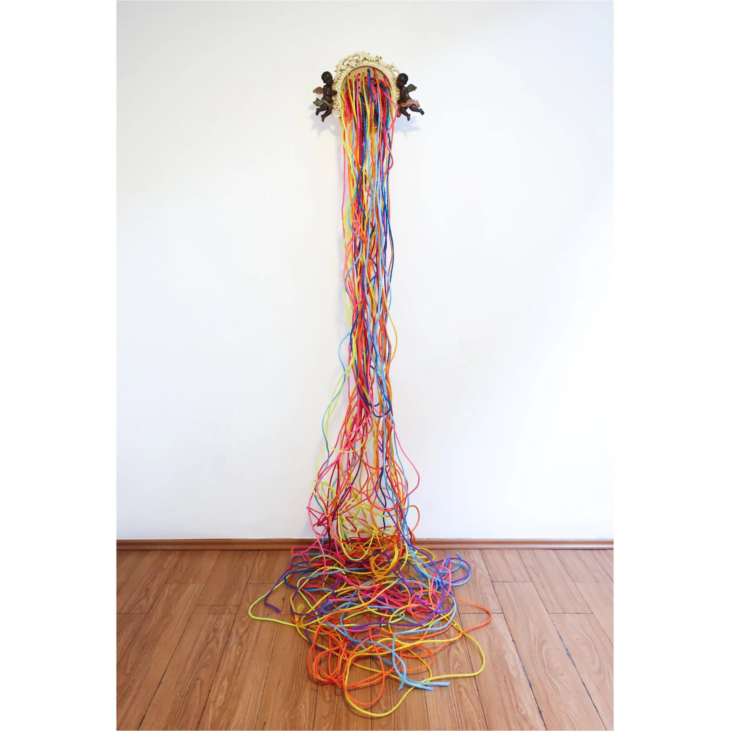 jewelette, 2020, flower arrangement by the artist, plastic cellophane, rubber bands, 16" x 16" x 25"